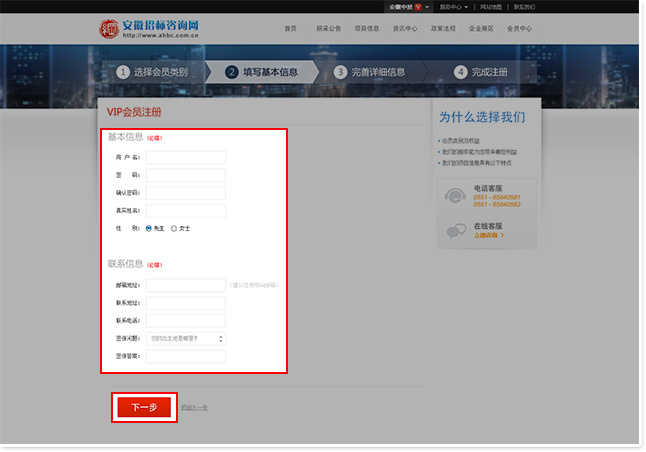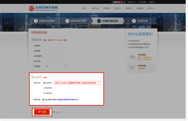 第四步完善详细资料,也可稍后在“个人中心”完善。选择付款方式后,阅读并同意服务条款后选择“我接受 安徽招标咨询网服务协议 ”,然后点击“下一步”。